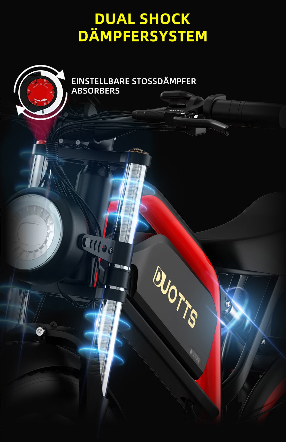 Entdecken Sie eine neue Ära des Radfahrens mit dem DUOTTS N26 Elektrofahrrad. Es verfügt über einen leichten Aluminiumrahmen, einen leistungsstarken 48-V-Motor und mehrere Fahrmodi. Erleben Sie Geländetauglichkeit mit hydraulischen Bremsen und komfortabler Federung. Der leistungsstarke Akku ermöglicht eine Reichweite von 40-60 km im Elektromodus und 100-120 km im Tretunterstützungsmodus. Das DUOTTS N26 zeigt Ihnen den Weg, fordert das Unbekannte heraus und entfesselt Ihre wilde Seite.