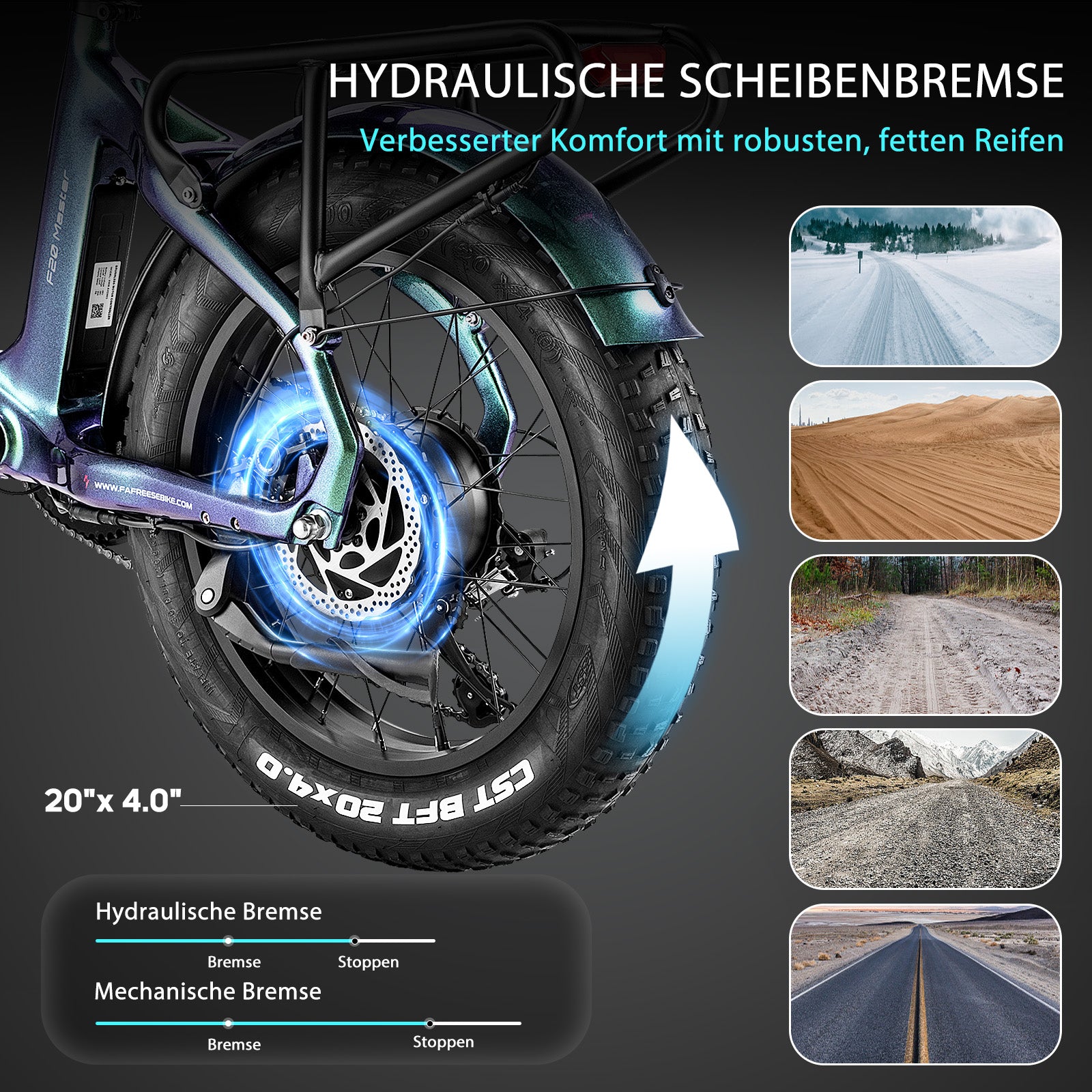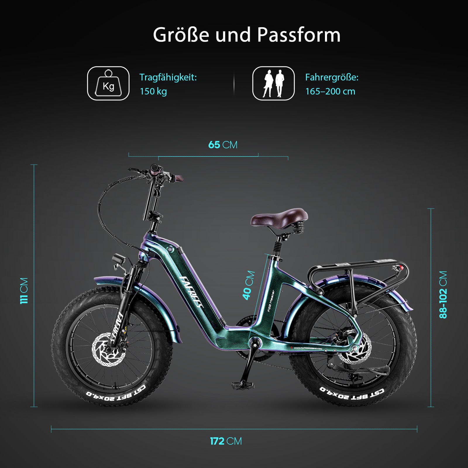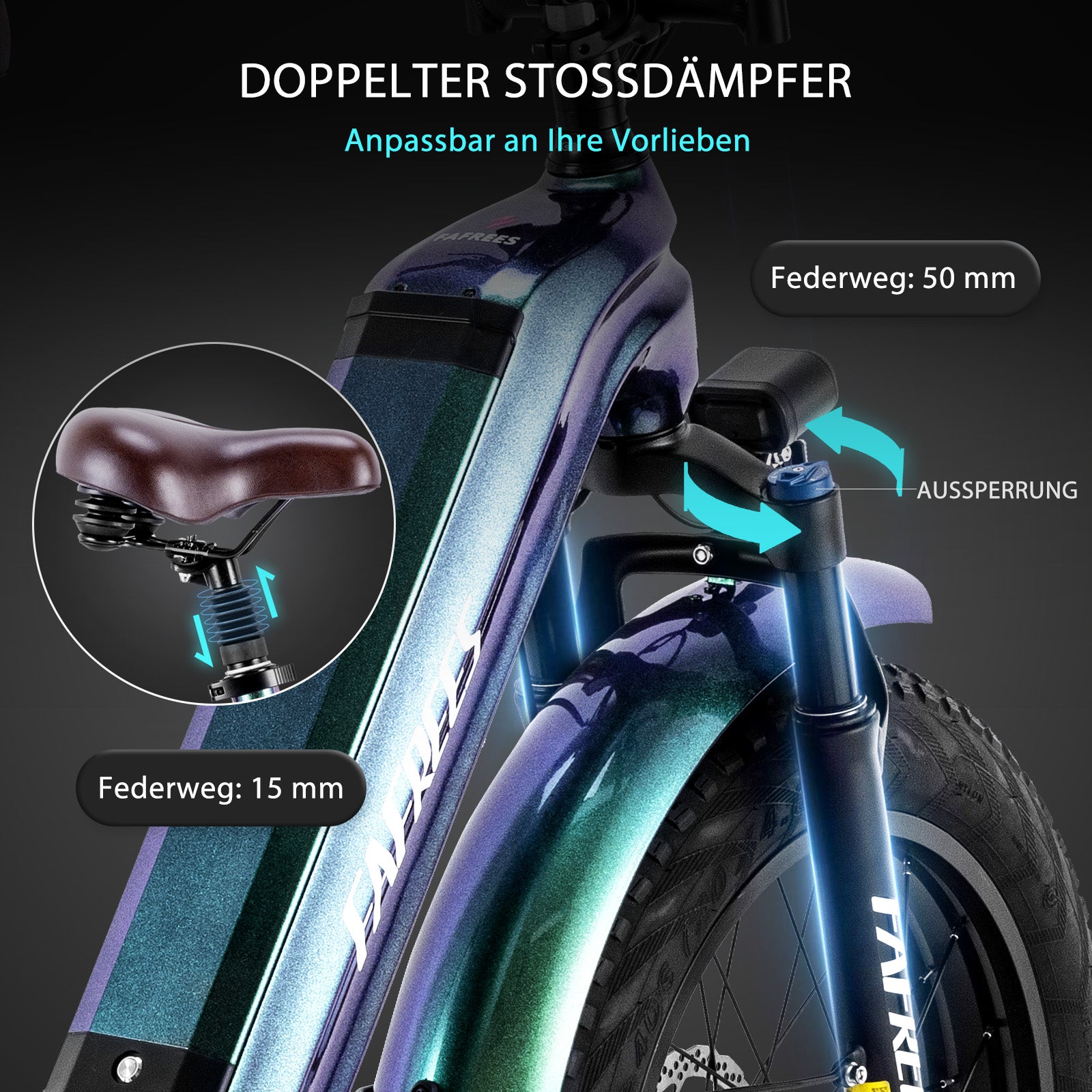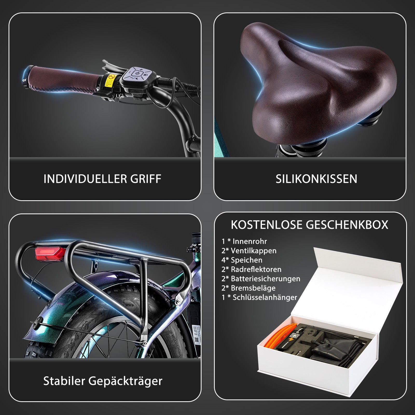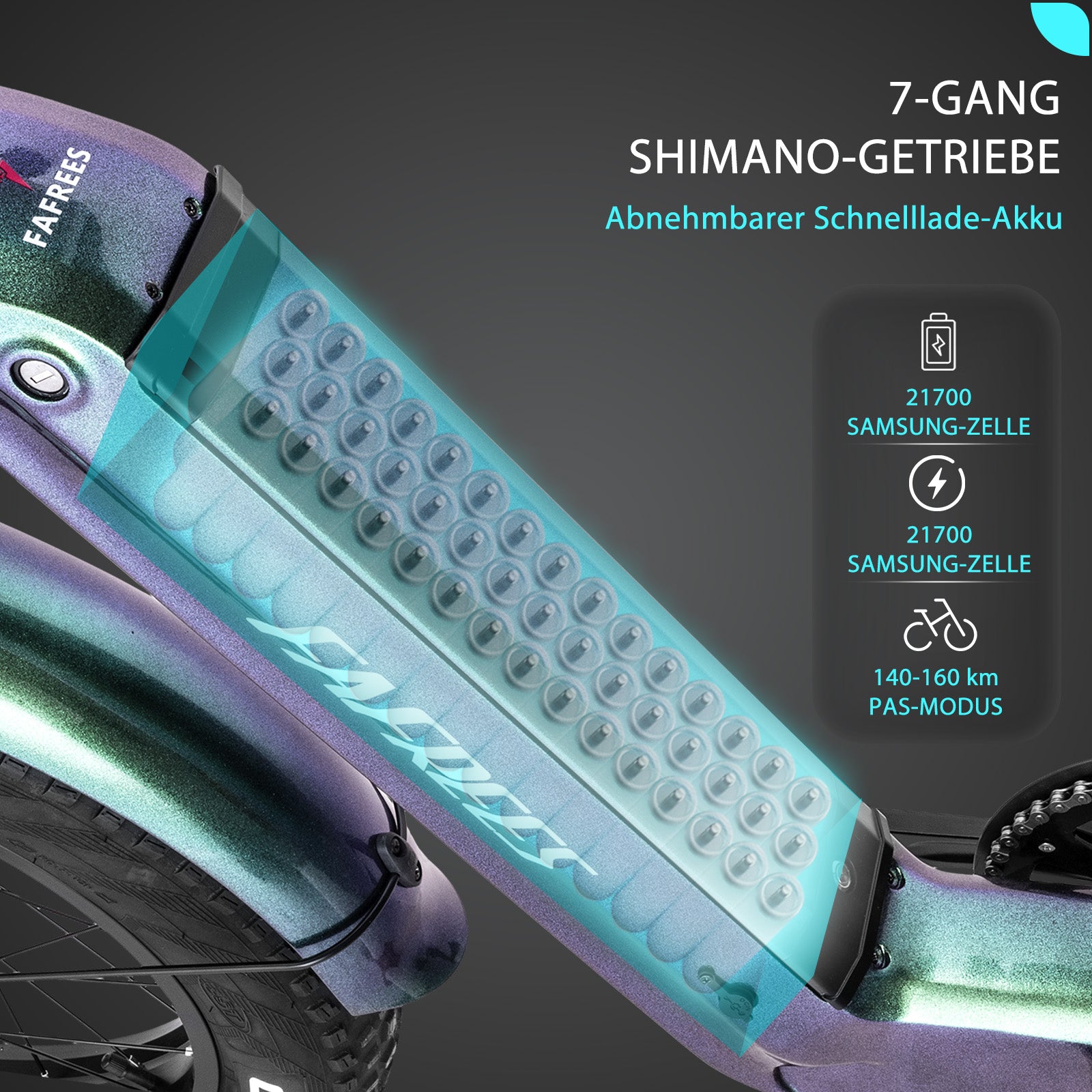 Das Fahrrad ist mit einer tragbaren 1080-Wh-Batterie mit 21 % höherer Dichte und 21700 Zellen ausgestattet, mit der Sie bis zu 120 Kilometer weit fahren können. Sein integriertes Design reduziert das Risiko von Kurzschlüssen und Feuchtigkeitsproblemen und sorgt für ein sicheres und zuverlässiges Fahrerlebnis.