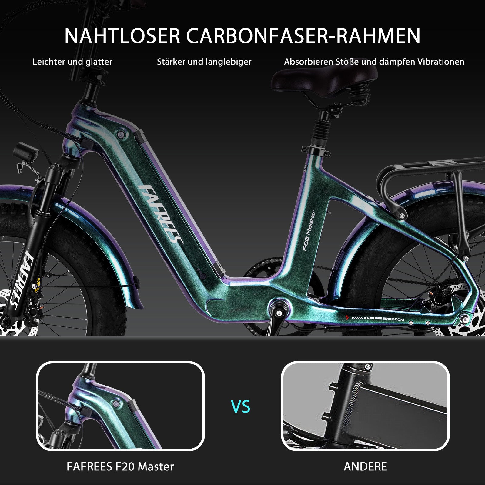 Der Kohlefaserrahmen macht das Fahrrad nicht nur leichter, sondern verbessert auch die Dämpfung und Steifigkeit. Während der Fahrt absorbiert er Stöße und dämpft Vibrationen. Durch das abgestufte Design ist es für Männer, Frauen und Menschen jeden Alters geeignet.