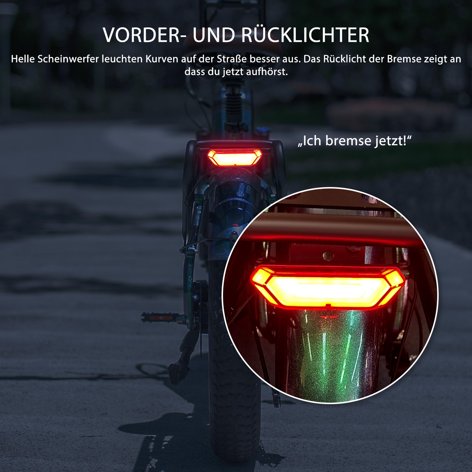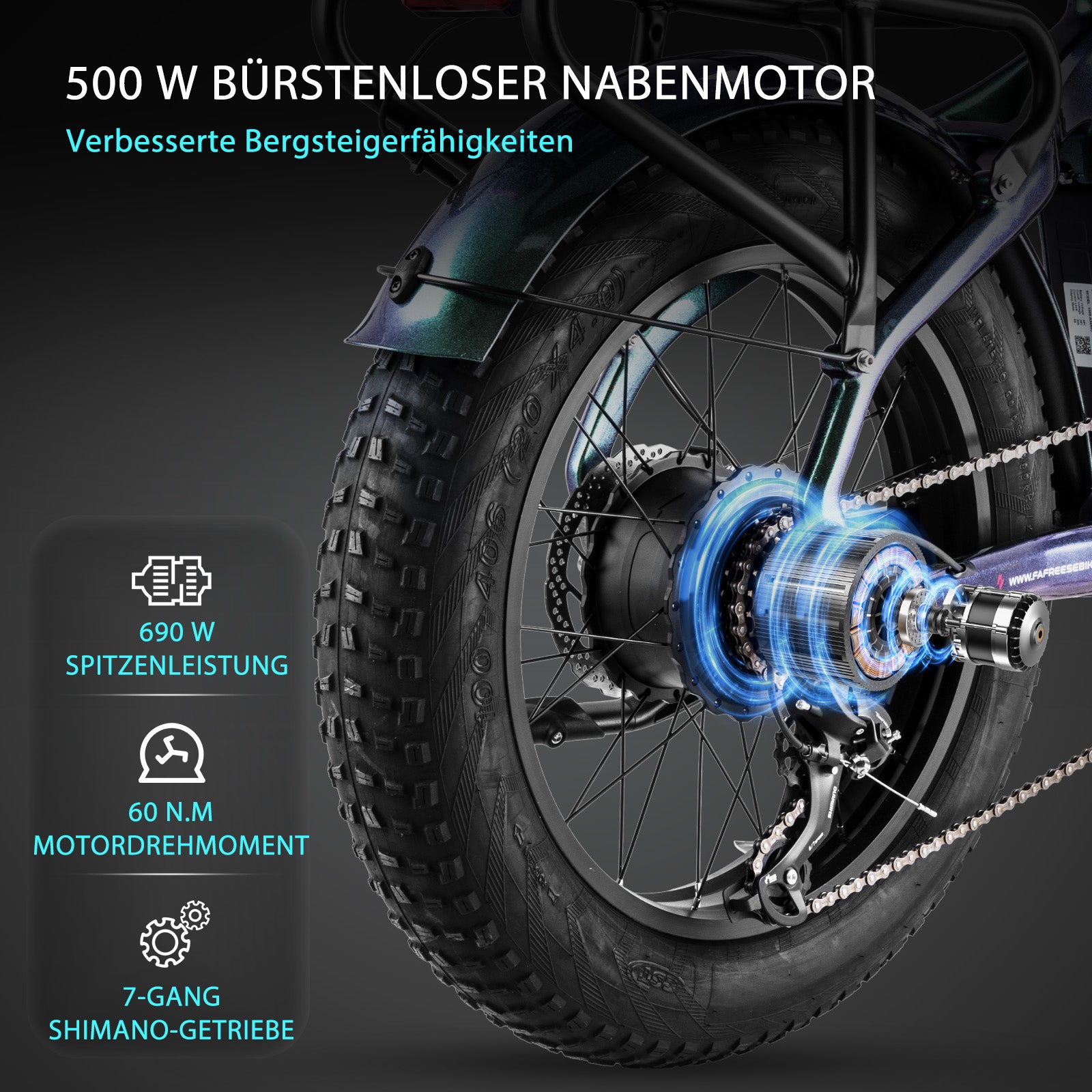 Genießen Sie Ihre Fahrt mit dem 500-W-Motor. Mit einer Spitzenleistung von 690W und einem Drehmoment von 65N.m können Sie auf jedem Gelände sicher fahren. Die Höchstgeschwindigkeit beträgt 45km/h. Dank der abnehmbaren Drosselklappe können Sie jederzeit vom reinen Elektromodus in den Unterstützungsmodus umschalten.